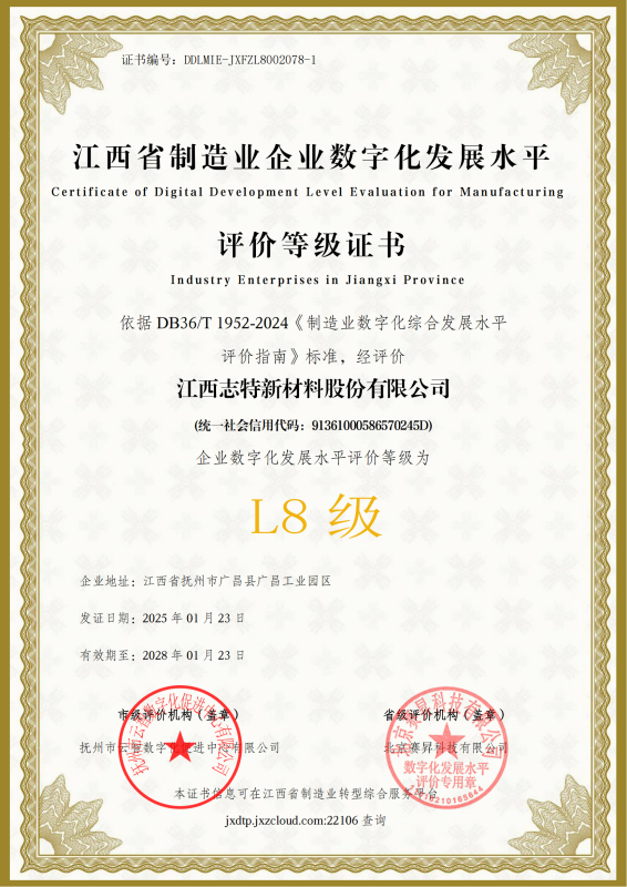 近日,志特新材(股票代码:SZ 300986)作为抚州市首家、江西省首批通过数字化转型L8评级认证企业,成功荣获“数字化转型L8贯标奖”。该奖项由江西省工业和信息化厅主导评定,标志着企业在智能制造能力成熟度、数字技术融合应用等维度达到行业领先水平。