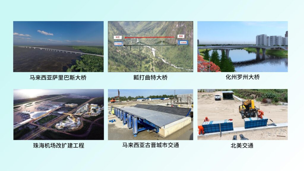 • 交通工程:瓤打曲特大桥、马来西亚萨⾥巴斯⼤桥(大跨度、海洋环境),展现复杂海域大型桥梁建造能力;珠海机场改扩建工程(不停航施工、空间受限)、郑州地铁6号线车辆段(多专业密集交叉)、北美交通项目(高标准规范)体现空间受限与多工序协同的高效精准管控;马来西亚古晋城市交通项目(城市密集区施工),展现了其对空间受限、多工序协同场景的精准把控;