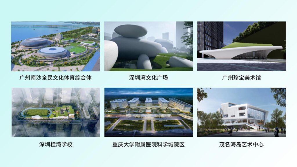 • 公共建筑:广州南沙全民文化体育综合体(大型场馆)、深圳湾文化广场(异形文化空间)、广州珍宝美术馆(艺术空间精度)、深圳桂湾学校(教育基建)、重庆大学附属医院科学城院区(复杂医疗建筑)、茂名海岛艺术中心(滨海特殊环境),体现精准服务多元公共建筑的高标准、复杂化建造要求。