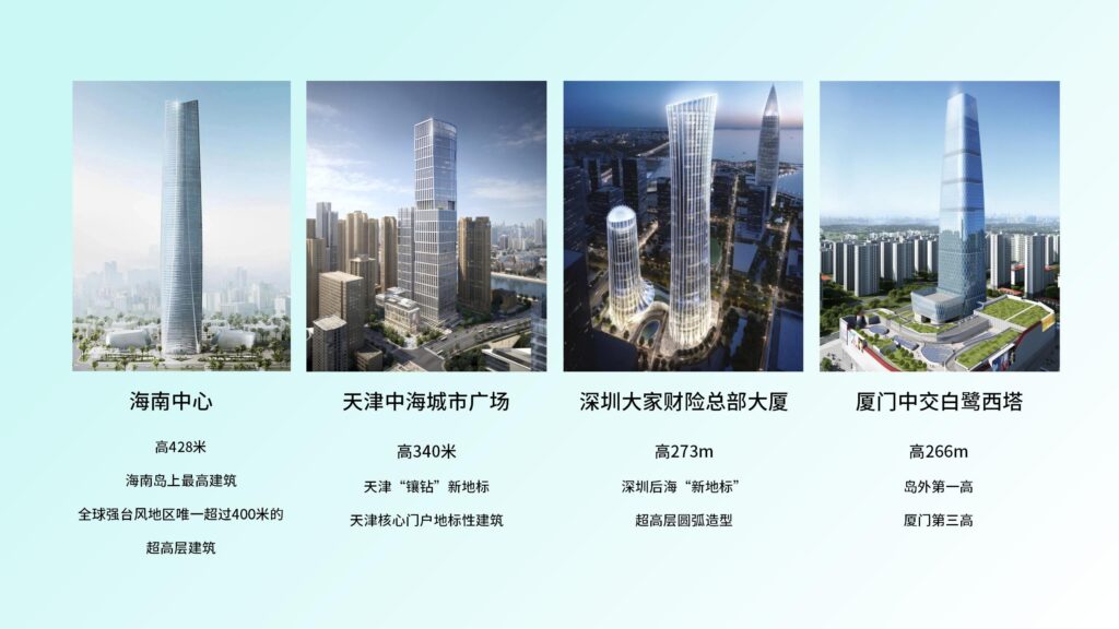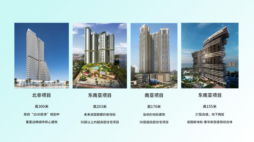 • 地标建筑:北非、东南亚、南亚等国际项目征服超高层建造极限,适配市场核心区建设;海南中心、天津城市广场、深圳大家财险总部大厦等超高层地标,持续助力中国城市天际线升级。