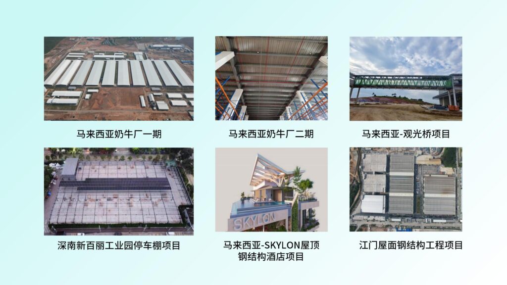 • 钢结构工程:马来西亚奶牛厂一期(大型农业设施)、马来西亚-SKYLON屋顶钢结构酒店项目(异形屋面),彰显大跨度钢结构设计与施工能力;深南新百丽工业园停车棚项目(公共设施)、江门屋面钢结构工程项目(工业建筑),体现多样化钢结构应用经验。