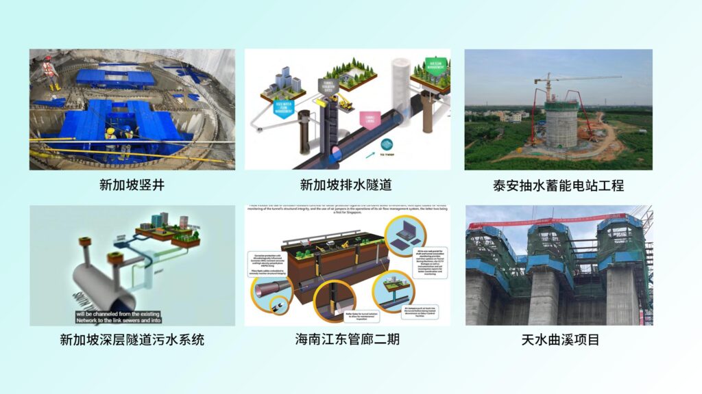 • 水利工程:新加坡深层隧道污水系统(水下工程、深埋竖井)、海南江东管廊二期(复杂管廊结构)等项目验证了其在水下工程、高落差结构中的技术实力;